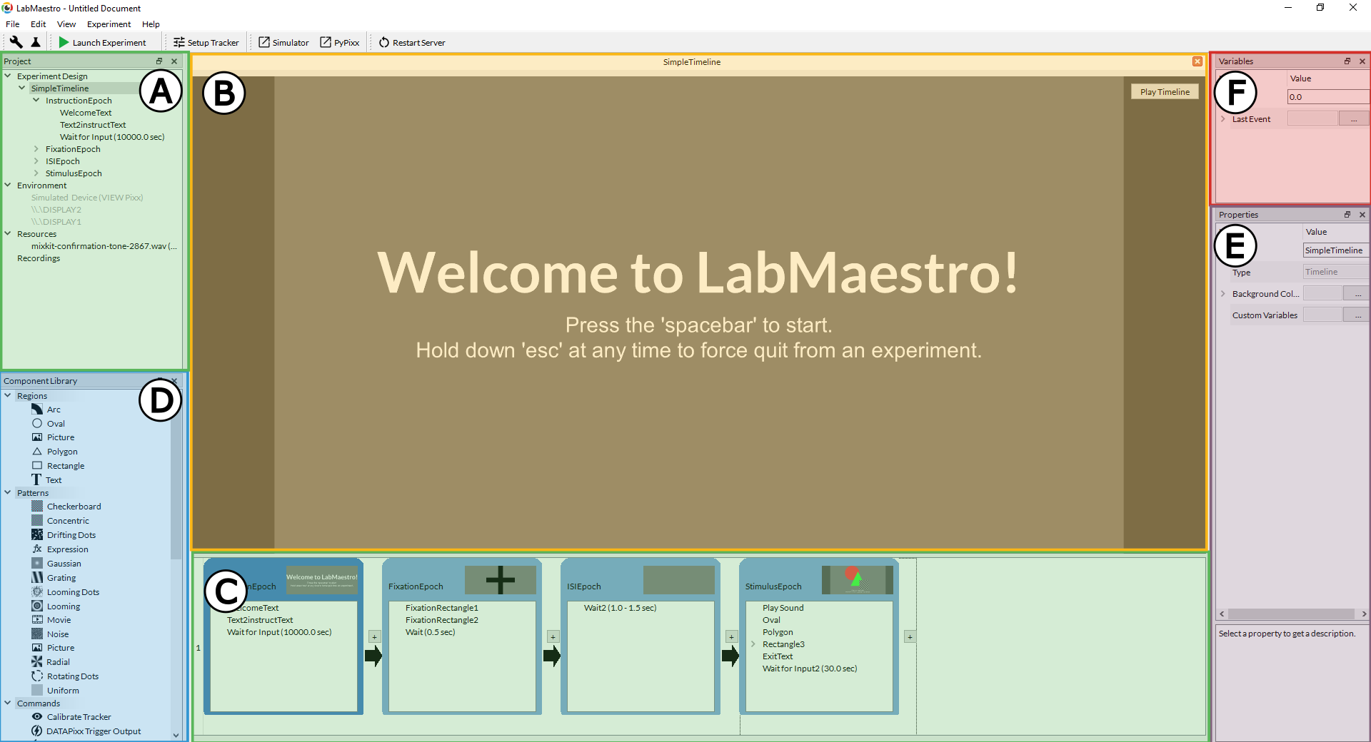 The Timeline Workspace presents a visual representation of overview of selected Timelines and Epochs , allowing users to see, at a glance, how Flow Control Within Timelines dictate how the experiment will be executed at runtime. The workspace automatically displays a scaled, static representation of the selected epoch, but also features a 'Play Timeline' that previews the real-time execution of the current timeline.