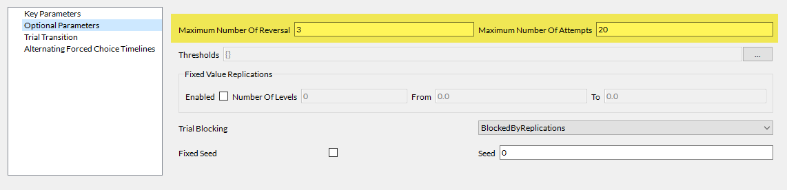 If you navigate to the optional parameters, you can find two stopping criteria. In this demonstration, we limited the maximum number of attempts (trials) per staircase to 20, and set the maximum number of reversals to 3.