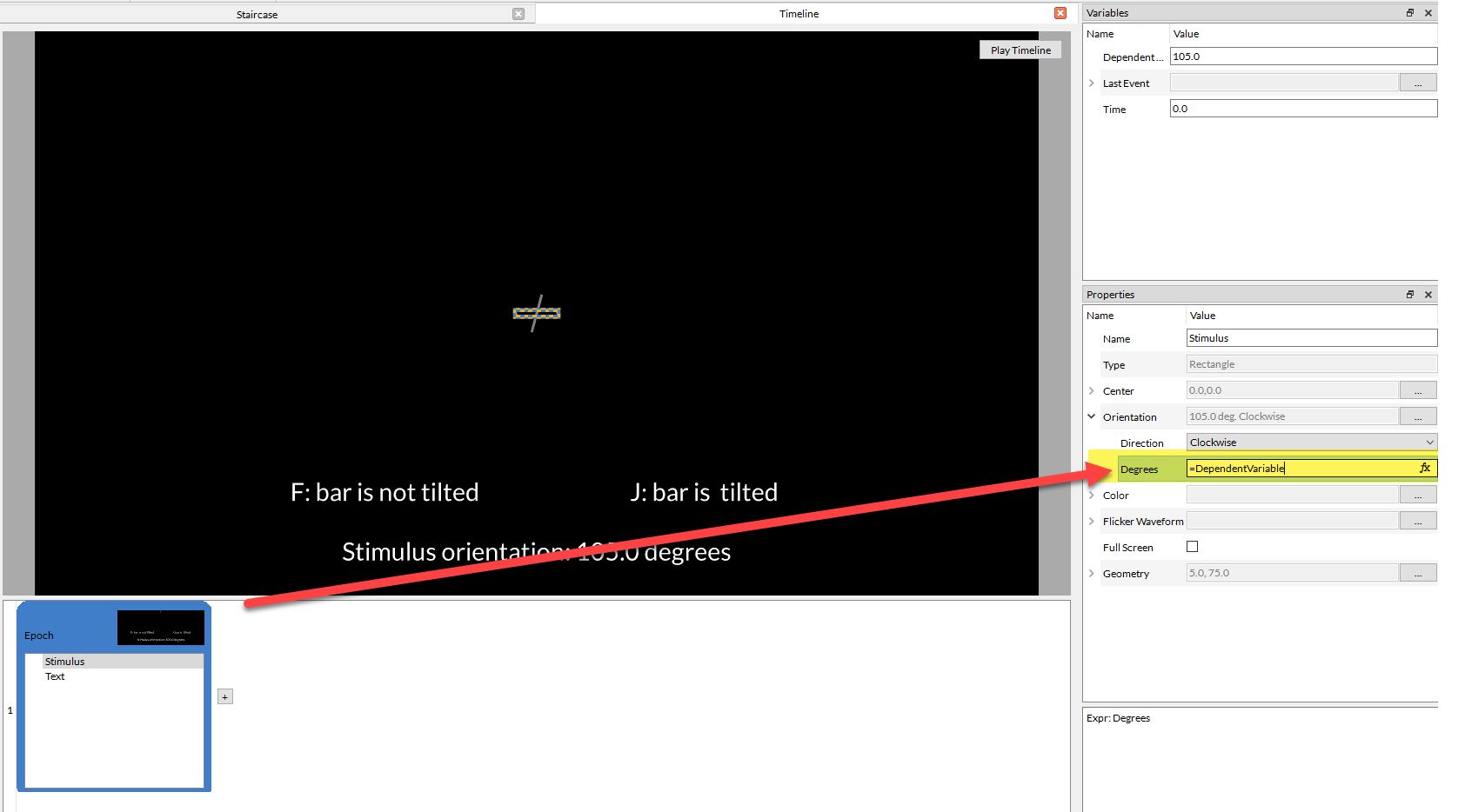 The ‘DependentVariable’ is updated on a trial to trial basis through an Expressions in the region’s Orientation field (seeRegion Orientation).