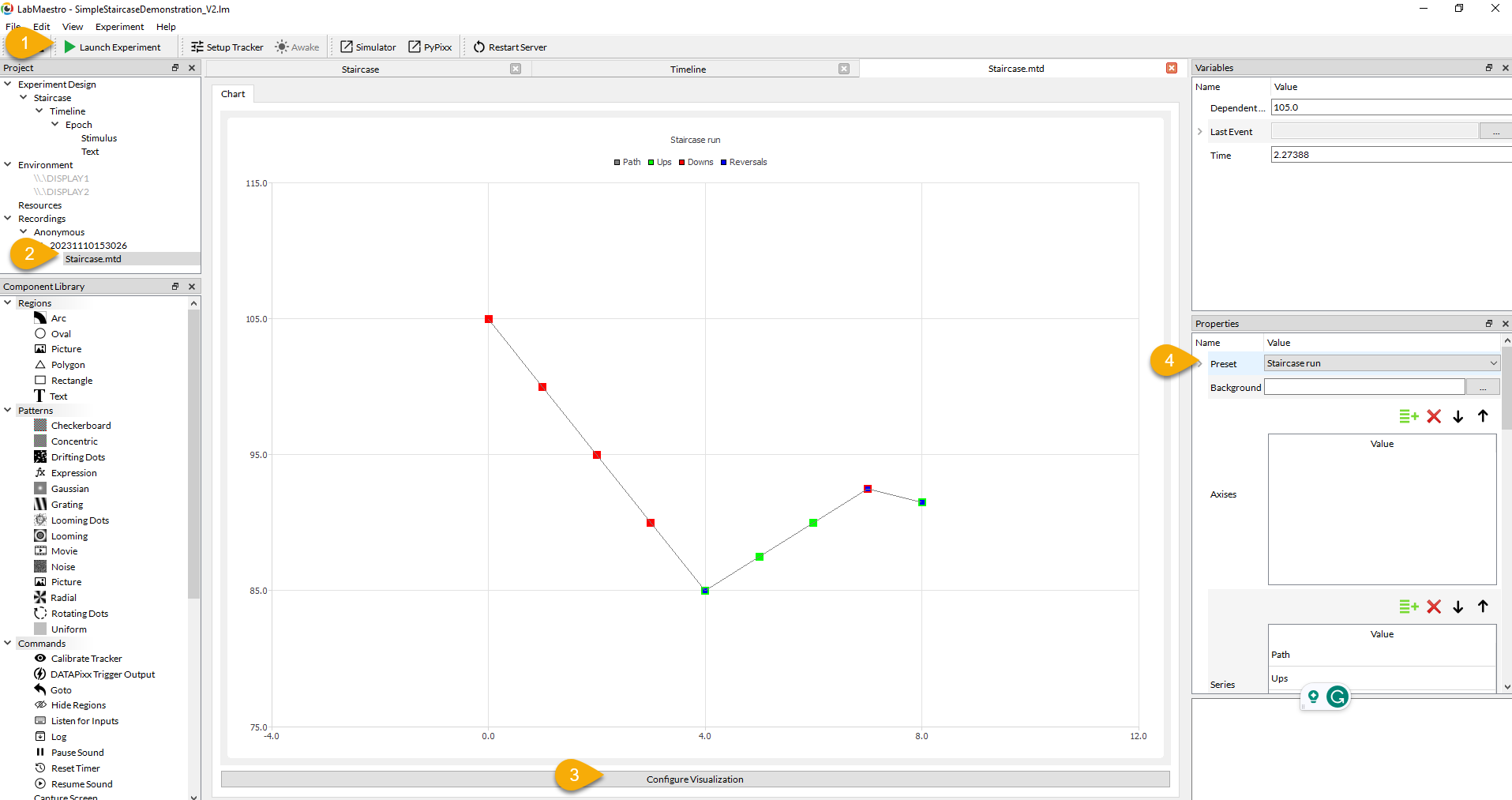 In this toy example, we will use 'DependentVariable' to tilt a bar, using a starting value of 105 degrees, with a range between 80.0 and 180.0 degrees, and a default step size of 5. After the first reversal, we reduce the step size to 2.5, and after the second reversal, to 1.0.