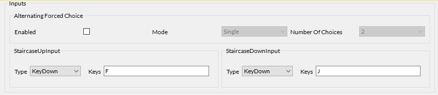 Inputs. In staircase methods, participant responses on a given trial modify the value of the 'DependentVariable' on the next trial. In the Inputs box, the effect of the keypress is implemented as follows. In this demo, if the participant perceives the bar to be tilted to the right, they press the J key and on the next trial, the tilt of the bar will be decreased. If the participant perceives it as not tilted, they press the F key, and on the next trial, the tilt of the bar will be increased.