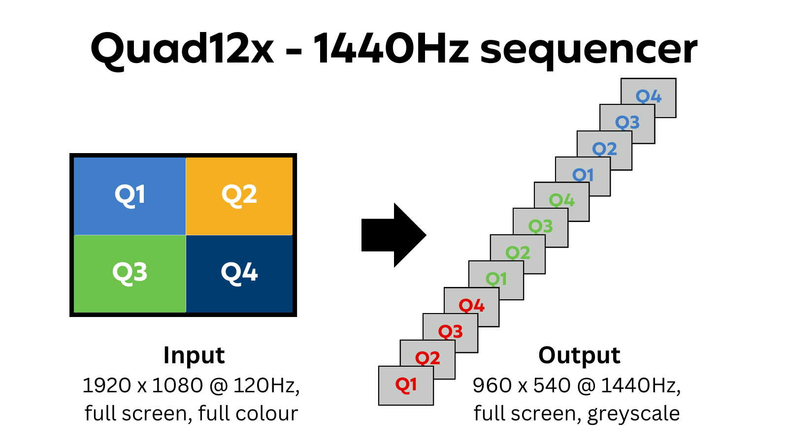 The PROPixx uses a “sequencer” to break up a single 1920 x 1080, 120 Hz RGB video signal into 12 multiple frames displayed in sequence. The 1920 x 1080 image is first divided into four 960 x 540 images, or “quadrants”, which are magnified to full screen. Each 8-bit RGB color channel is then converted to grayscale and displayed separately. The order of appearance is Q1 red, Q2 red, Q3 red, Q4 red, and then this order is repeated for G and B channels.