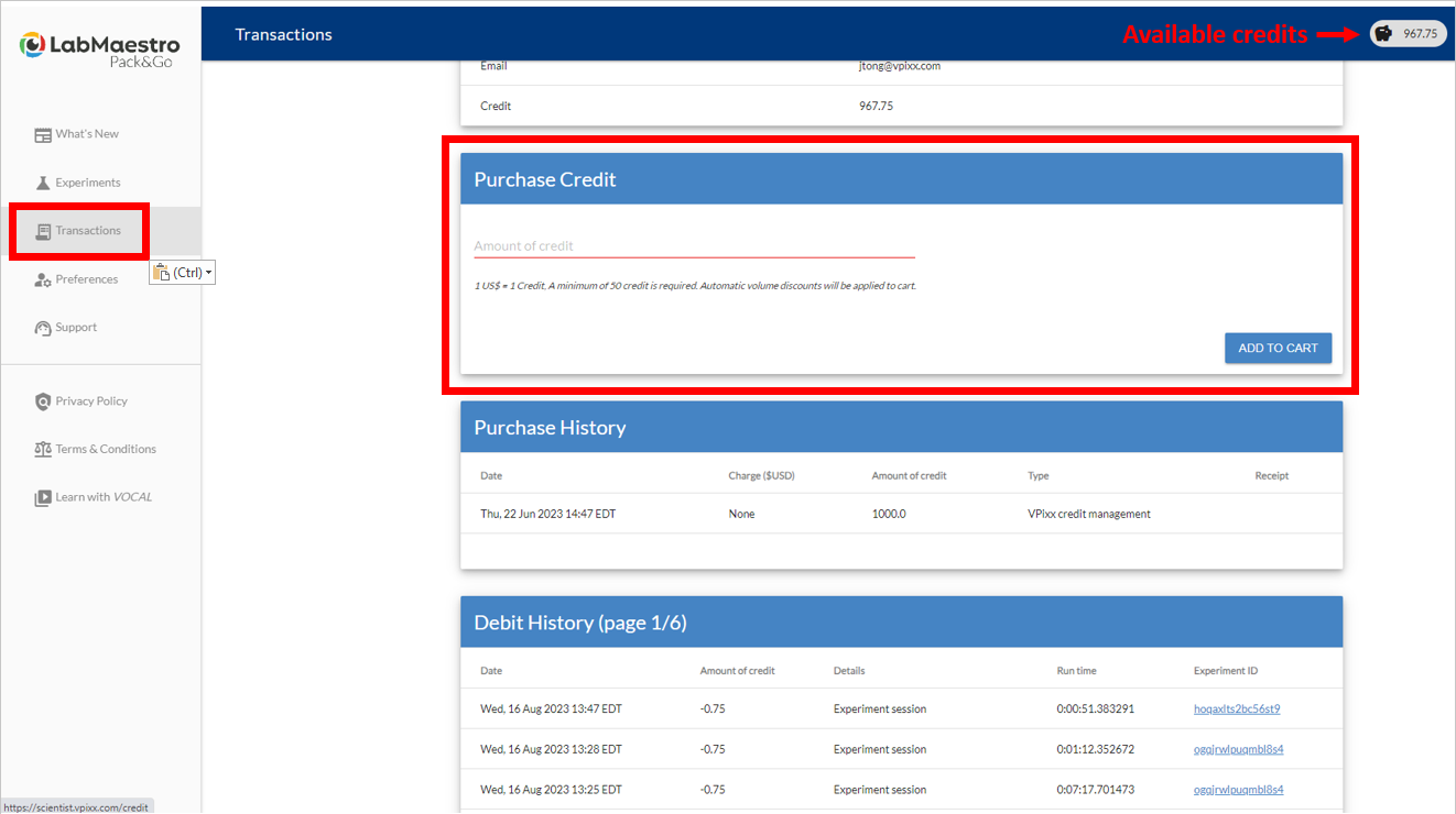 To purchase credits on the Scientist Portal, navigate to the “Transactions” tab and purchase some credits. The minimum transaction amount is 50 credits. The Transaction tab also shows your credit balance, purchase history and receipts, and debit history.