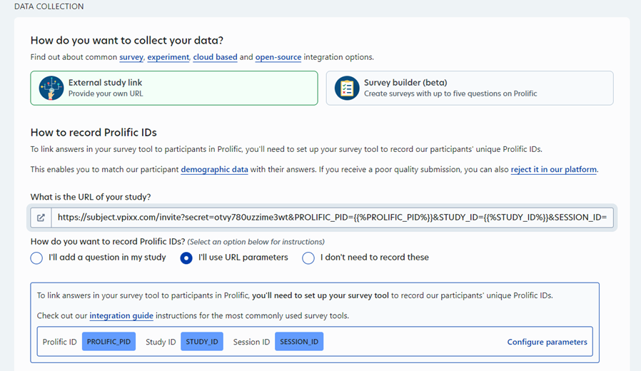 Back in Prolific, My Workspace, where you edit study settings (see step 1), navigate down to DATA COLLECTION -> “How to record Prolific IDs”. In the field “What is the URL of your study” Paste the URL of the Invite Link from previous step, and select the option “I’ll use URL parameters” (this step is necessary in order to access each subject’s Prolific, Study and Session ID in the results file after the experiment, see step 8):