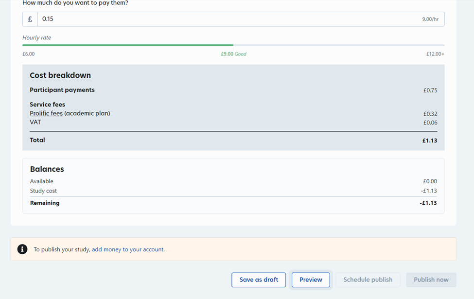 Scroll down to the bottom of the page and click “Preview” to start a test run from Prolific