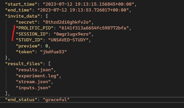 The 3 prolific IDs (Prolific ID, Study ID and Session ID) should be present on the results.json file, in each session results: