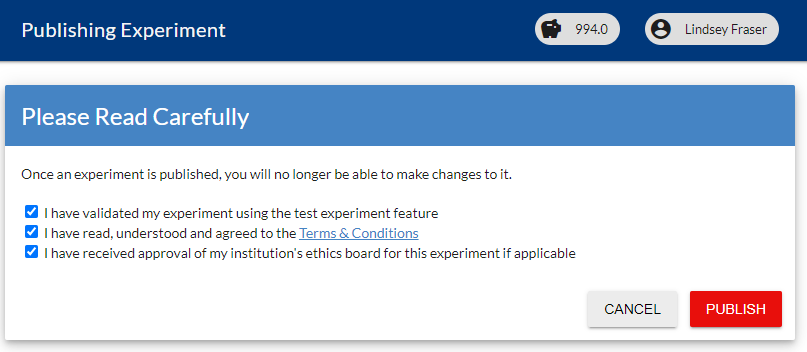 You will be asked to confirm some details before the study can be published. Check the boxes to accept and click Publish: