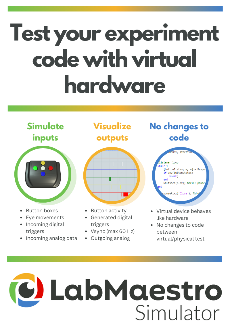 The LabMaestro Hardware Simulator enables testing of experimental code without the need for a physical connection to our devices. Eliminate the necessity of booking expensive research suites or equipment time during the development and testing phase, and share virtual environments with collaborators easily.