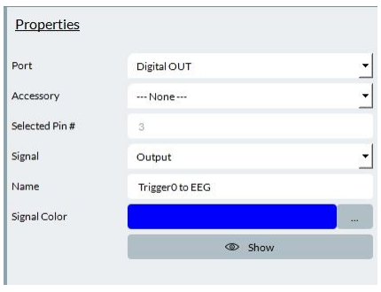 Digital outputs can be controlled via your code, as if you were triggering external equipment. In the UI, you can name your signal to represent its purpose. For example, you could name a trigger sent to an EEG Recorder “EEG Trig 0”.
