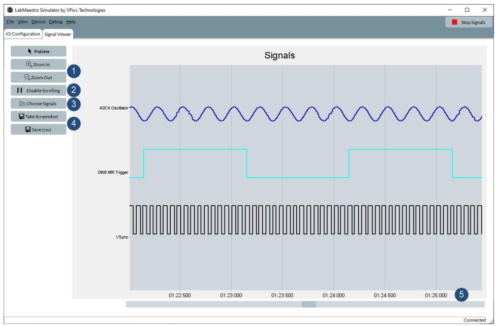 The signal viewer is a tool to preview any kind of signal sent or received by a VPixx device. If your code generates triggers, the graph will show you the real-time states of all the inputs and outputs of your device.