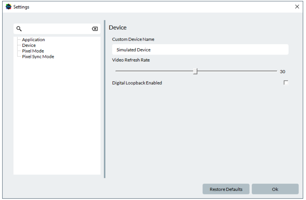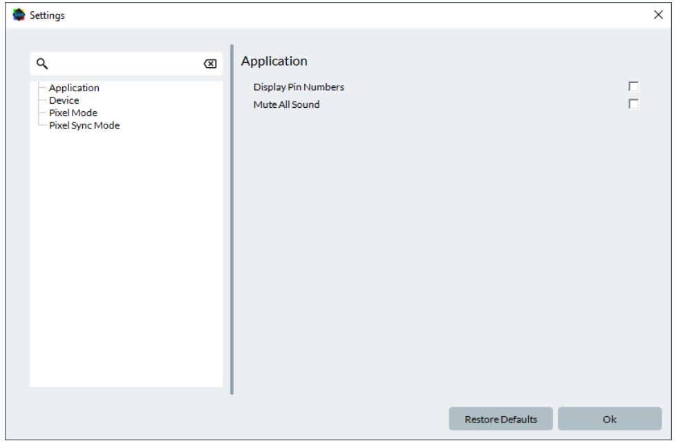 Accessed via the main menu (File -> Settings), four categories of settings currently exist: Application, Device, Pixel Mode and Pixel Sync Mode