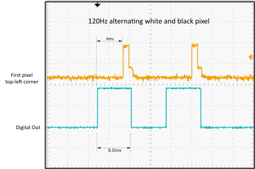 Example digital out TTL trigger sent on reception of vertical sync pulse, relative to top left pixel illumination