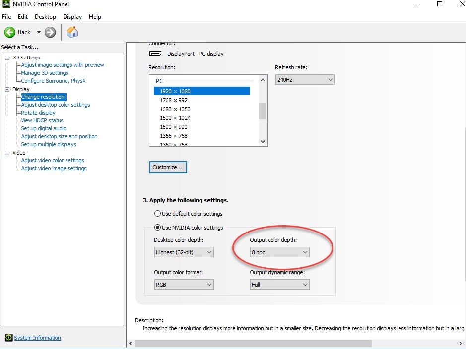 NVIDIA Control Panel with output colour depth set to 8 bits per colour.