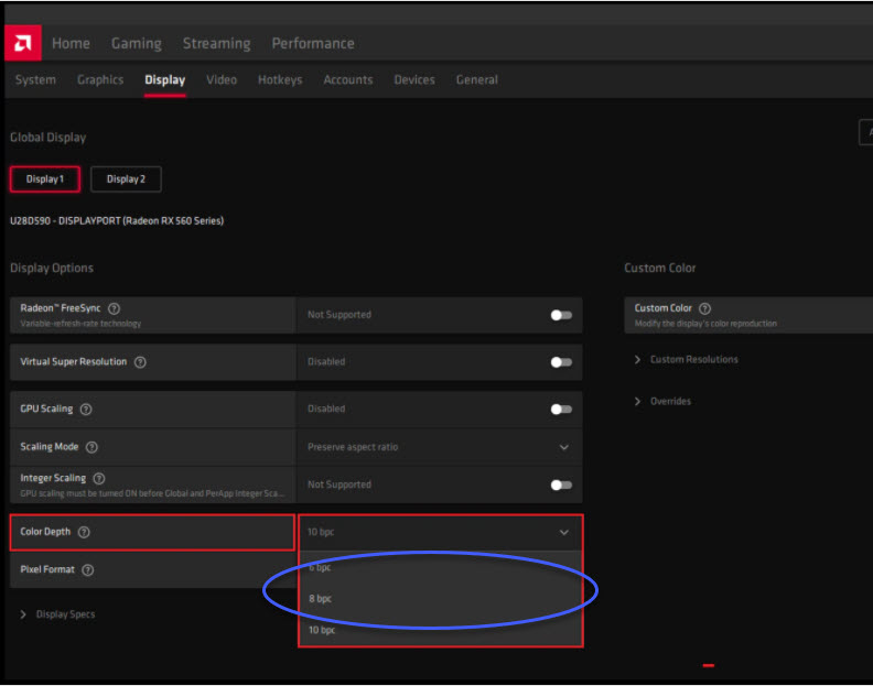In some cases, there may not be an explicit method for disabling dithering, but you can adjust your graphics card settings in order to effectively turn it off. This is true for a lot of Windows graphics card settings. Rather than having an explicit reference to dithering, they instead allow the user to set the bit depth under the ‘color settings.’ Setting your output colour depth to 8 bpc (bits per colour) can discourage your graphics card from trying to dither its way up to a higher bit depth.