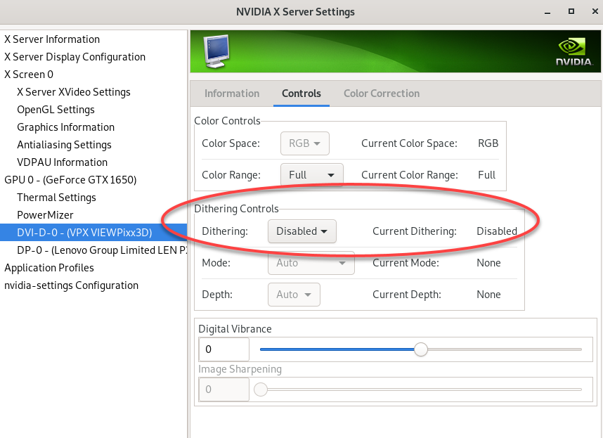 Most graphics cards have a manufacturer-specific control panel or settings manager that allows you to manually adjust graphics output characteristics. Some of these managers have explicit options to disable/enable dithering. For example, NVIDIA X Server Settings for Ubuntu (using the NVIDIA proprietary drivers) has a pane under their GPU ‘Controls’ tab that lets the user turn off dithering via drop down menu.