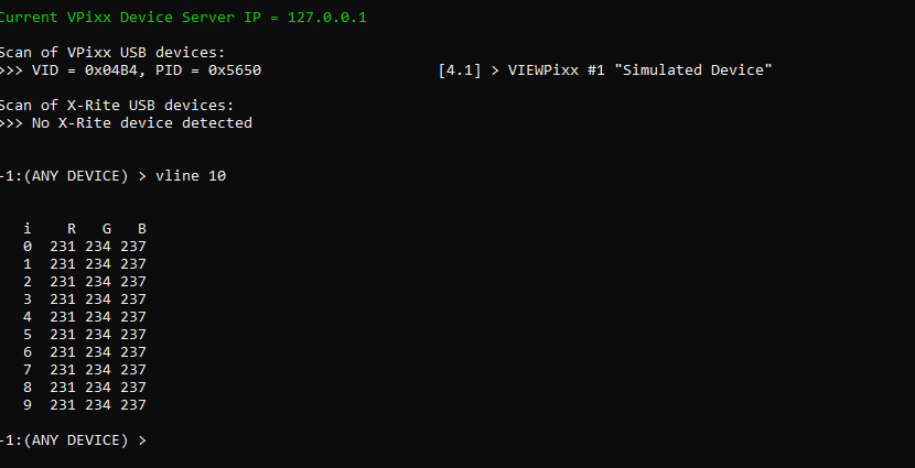Our MATLAB/Psychtoolbox and Python APIs both include a vline command, as does our command-line program VPutil. Use the tabs below to see code example for how to run a vline test using one of these tools and a simple grayscale ramp. You may wish to alter the tested RGB values for further diagnostics.
