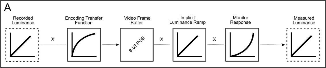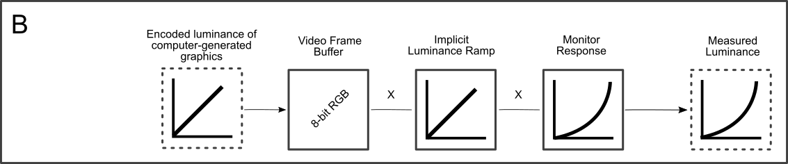 As vision scientists, we typically generate entirely new images and wish to send them directly to the graphic card’s video buffer. However, as seen in Sequence B, below, bypassing an encoding transfer function means that the monitor’s gamma will de-linearize our stimuli, greatly altering our intended stimulus.