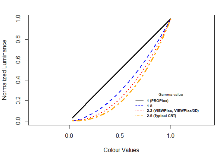 The relationship between the pixel colour value (the signal) and the luminance of a display typically follows a power function. Notably, the gamma of a PROPixx projector is 1, and requires no correction.