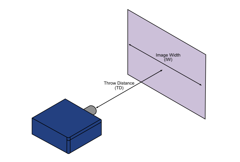 The PROPixx is fitted with a lens chosen to produce the desired image width (IW) at the desired throw distance (TD). TD is the distance measured from the front of the projector to the screen. The throw ratio (TR) characterizes the correct lens for your application where TR = TD/IW.