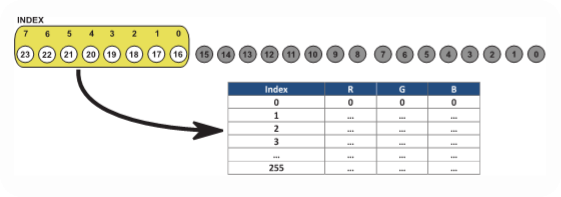 The CLUT may be updated dynamically between frames, allowing access to the full 16-bit colour gamut across an experiment; however, a single video frame may contain a maximum of 256 unique colours.