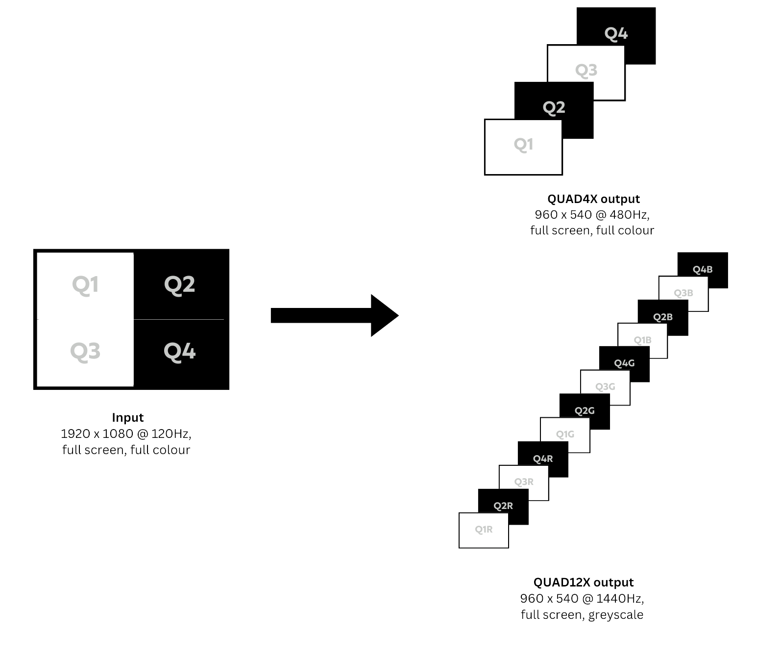 To display alternating white and black frames in QUAD4X and QUAD12X, we can send the PROPixx a half-black, half-white frame at 120Hz (every 8.33 ms). QUAD4X will break this down into four quadrants, shown sequentially; QUAD12X will show each quadrant for red, green and blue colour channels individually (as 8-bit greyscale).